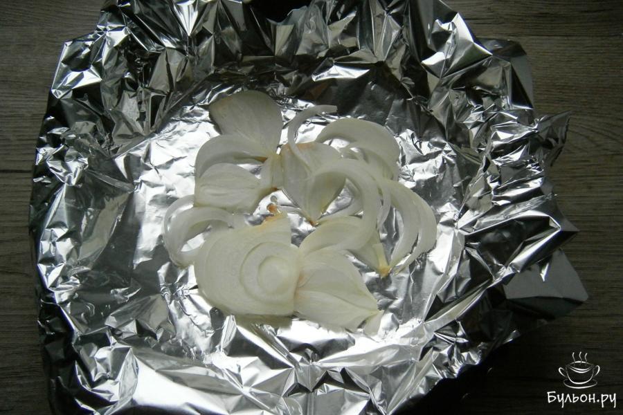 4. Листом фольги застелить форму для выпечки, разместить в ней порезанный полукольцами или произвольными крупными кусочками репчатый лук, полить его растительным маслом.