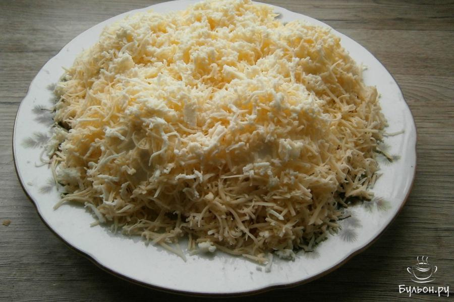 10. Засыпать весь салат тертым твердым сыром и раскрошенной или, также, натертой брынзой, чтобы по виду все напоминало снежные сугробы. Салат готов. Приятного аппетита.