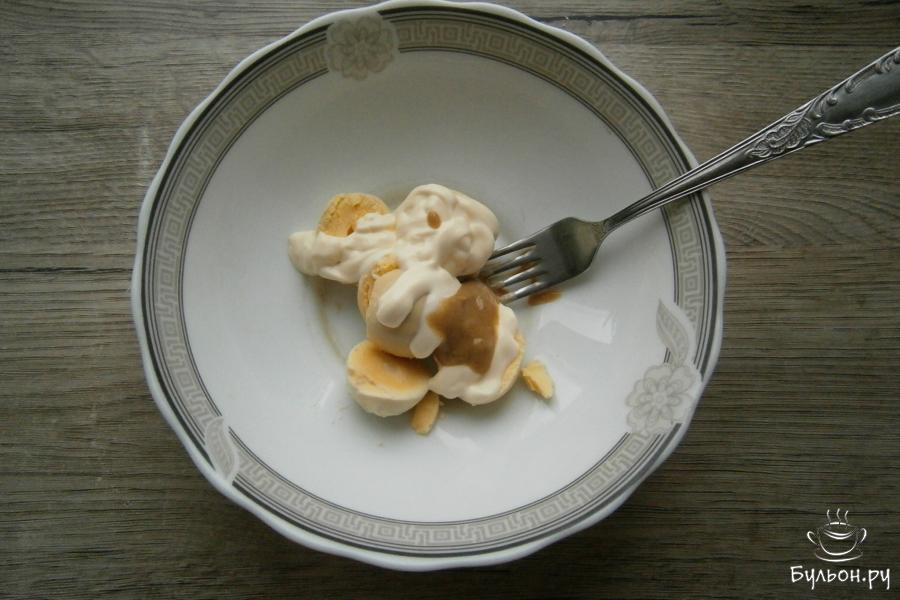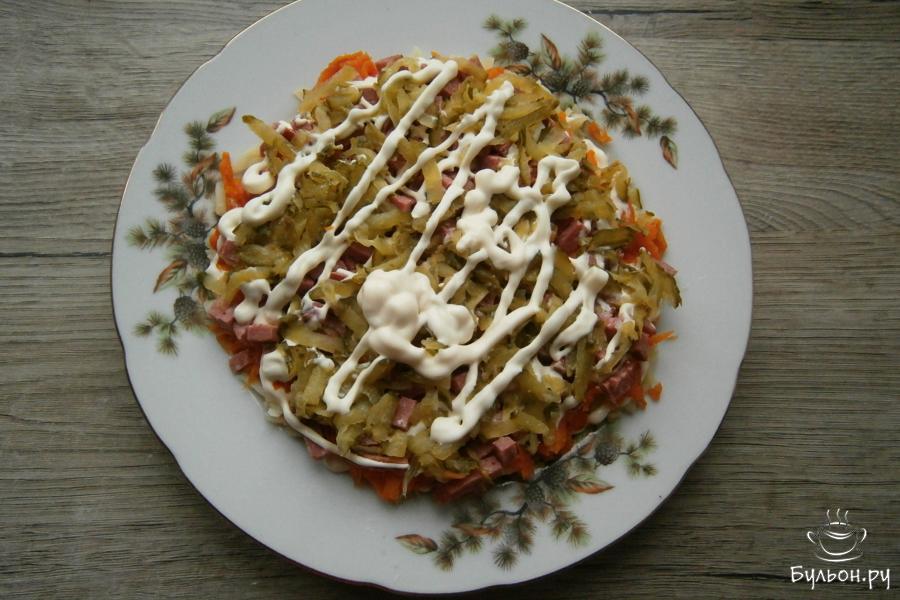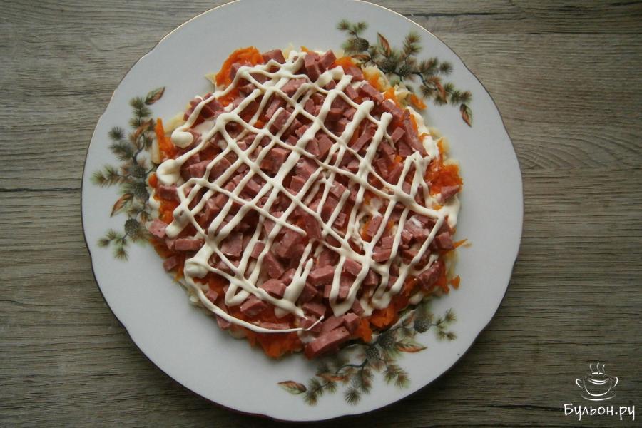 3. Колбасу копченую или варено-копченую порезать кубиками - это будет следующий слой и сеточка из майонеза.