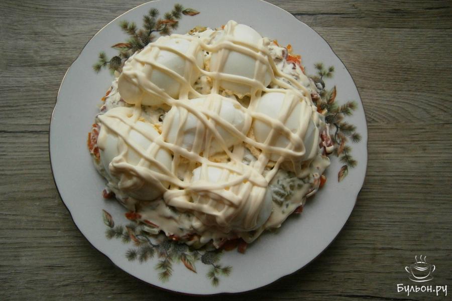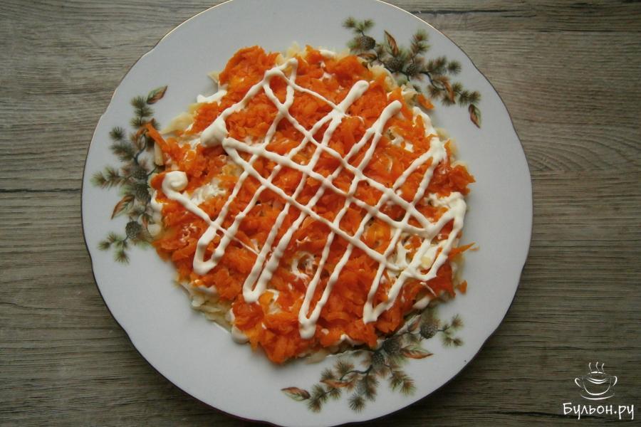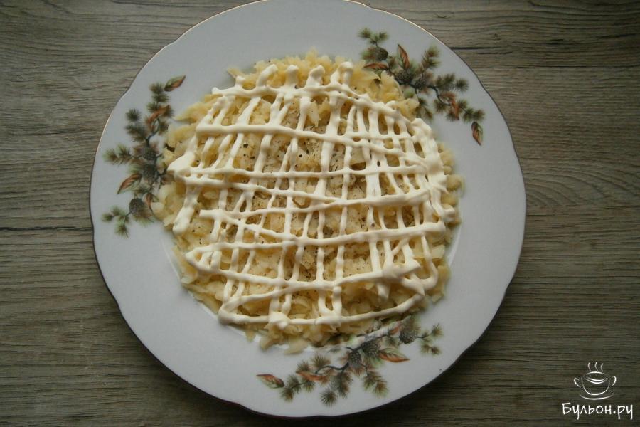 1. Картофель, средней величины морковку и яйца следует отварить предварительно, остудить и почистить. Все овощи натирать на средней или мелкой терке. Первым слоем выложить тертый картофель, который чуточку посолить и посыпать перцем. Смазать слой майонезом в виде сеточки.