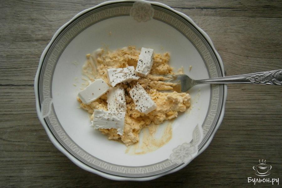 7. Хорошенько все растереть вилкой и добавить любой мягкий рассольный сыр, у меня - фета, посыпать немножко перцем.