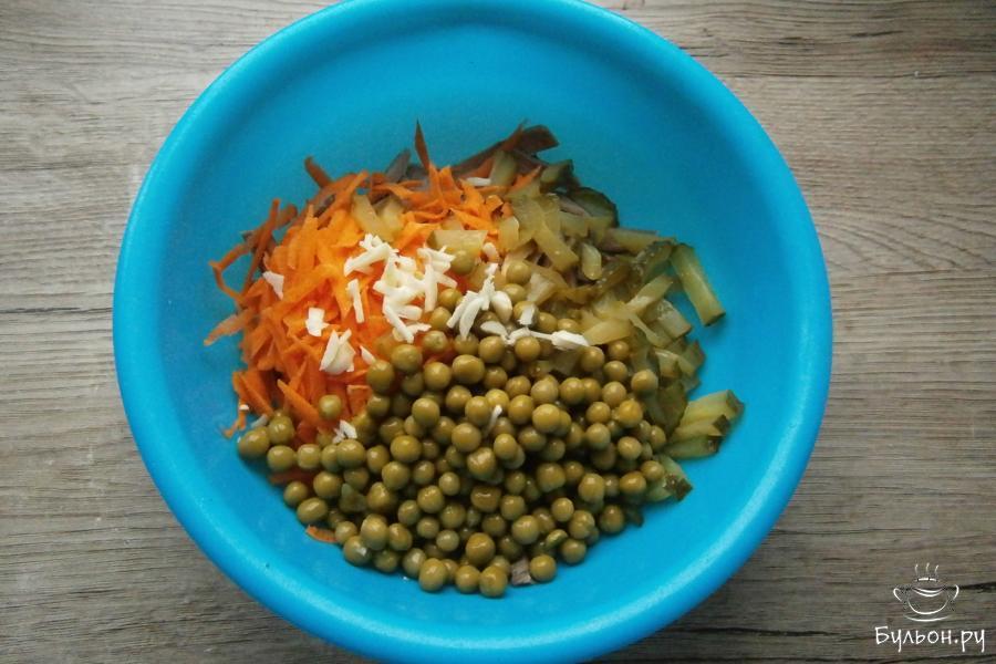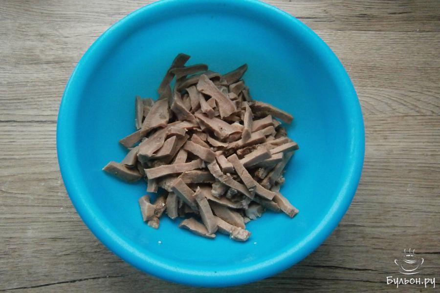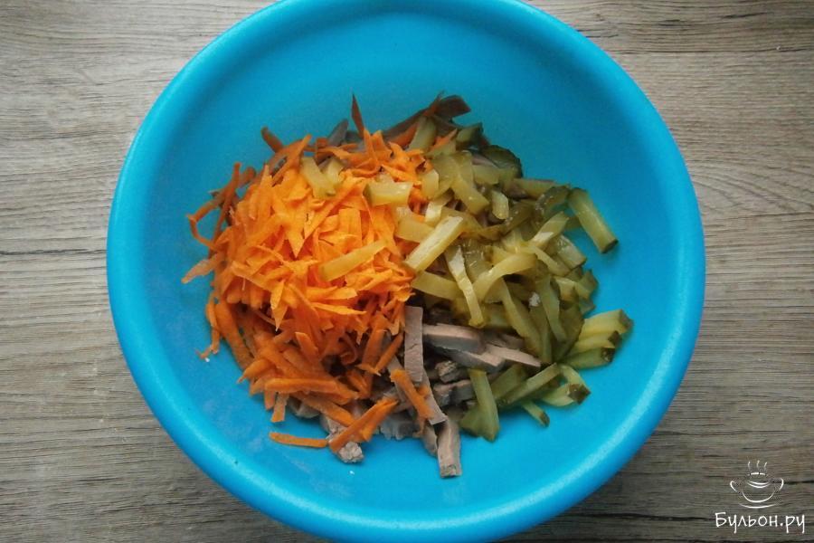 4. Маринованный огурец порезать соломкой или тонкими брусочками, морковку натереть. Добавить все к порезанному языку.