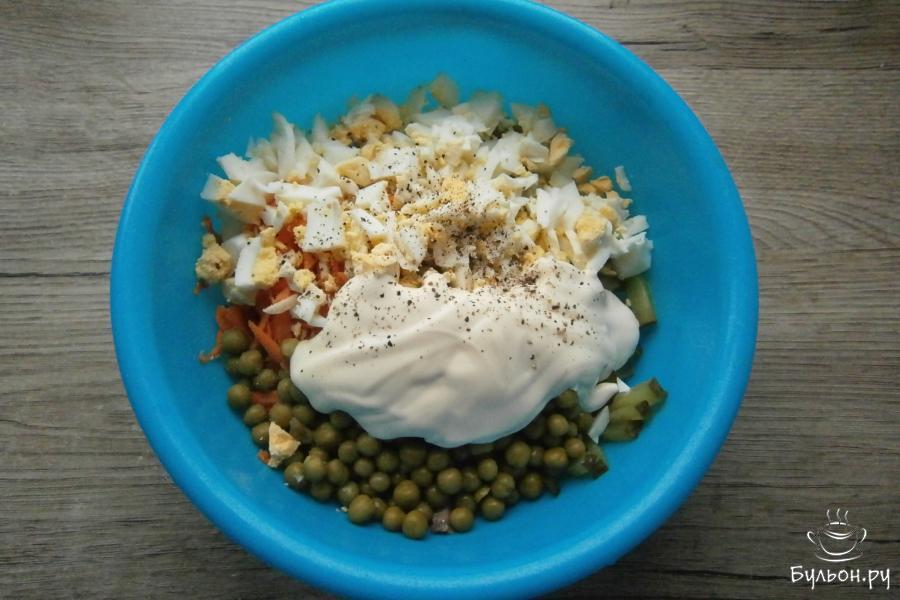 6. Яйца, предварительно сваренные вкрутую, почистить и порубить. Добавить яйца в салат вместе с майонезом, все немного посолить и по вкусу поперчить свежемолотым перцем.