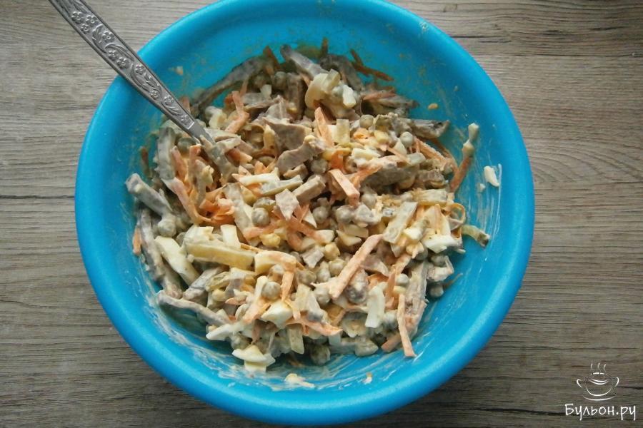 Говяжий язык считается деликатесом и стоит достаточно дорого. Хозяйки, обычно, приобретают этот субпродукт к праздникам. Свиной язык меньше размером и стоит на порядок дешевле, поэтому его можно использовать для приготовления различных блюд и для повседневного стола. Я хочу предложить попробовать простой и очень вкусный салат, который я приготовила со свиным языком. Конечно же, если у вас есть говяжий - можно использовать его. Салатик сытный и интересный, его можно подать на обед или ужин, а также, и на праздничный стол. Майонез лучше взять домашний или вовсе заменить его сметаной.