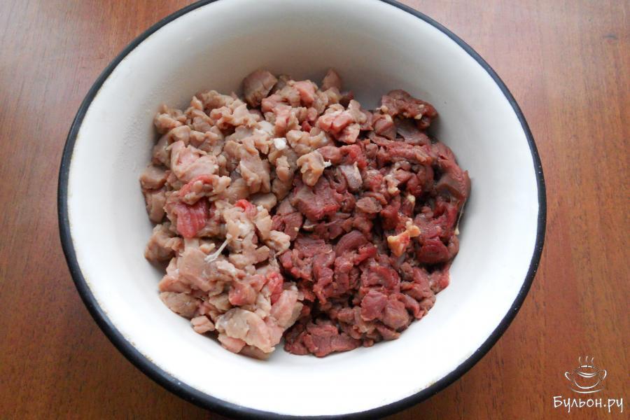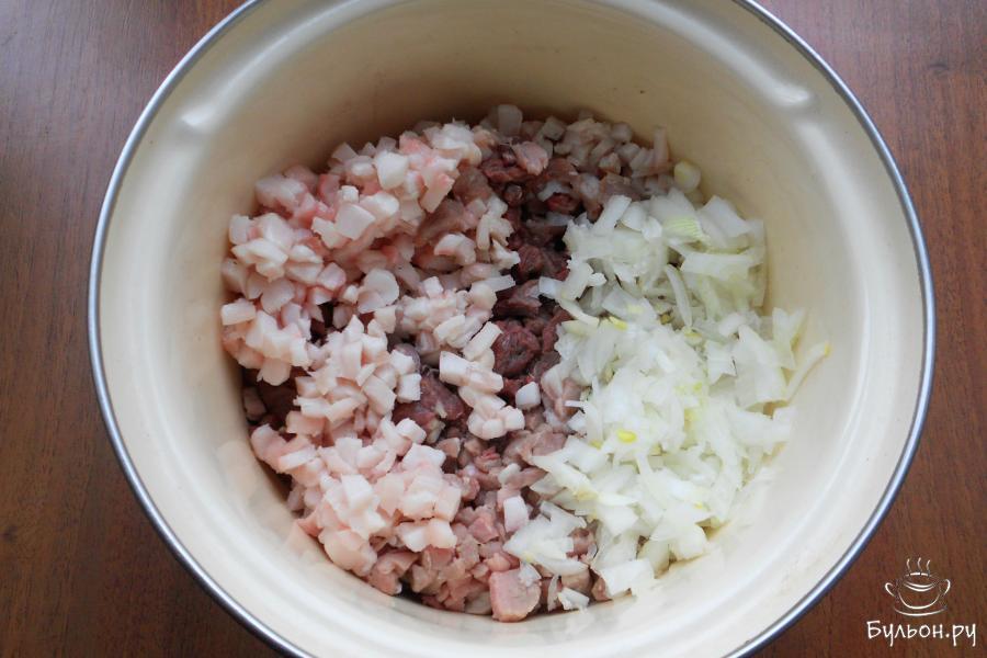 3. Все посолить, поперчить, добавить молотый кориандр. Если используете соленое сало, соль кладите по вкусу. Фарш тщательно вымешать и отбить. Мешать нужно долго, минут 15, фарш должен стать вязким и липким. Поместить фарш в холодильник на 1 час.