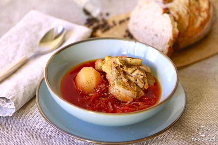 У каждой хозяйки есть свой рецепт борща. Готовят это первое блюдо не только в Украине, Белоруссии, но и в европейской части России. Сегодня хочу предложить вам рецепт борща из индейки. Мясо индейки для первого блюда лучше всего выбрать на кости, бульон получится более наваристым, ну и мясо не сухим. Этот рецепт мало чем отличается от классического рецепта. Овощи предварительно обжариваются, а вот чтобы свекла не потеряла цвет, то во время тушения нужно добавить лимонный сок или яблочный уксус. И еще один небольшой совет, если на выходе хотите получить сладкий борщ, то свеклу нужно выбирать спелую и сладкую. А если кислый, то можно добавить квашеную капусту. Для более интересной подачи, картофель отваривается целиком.