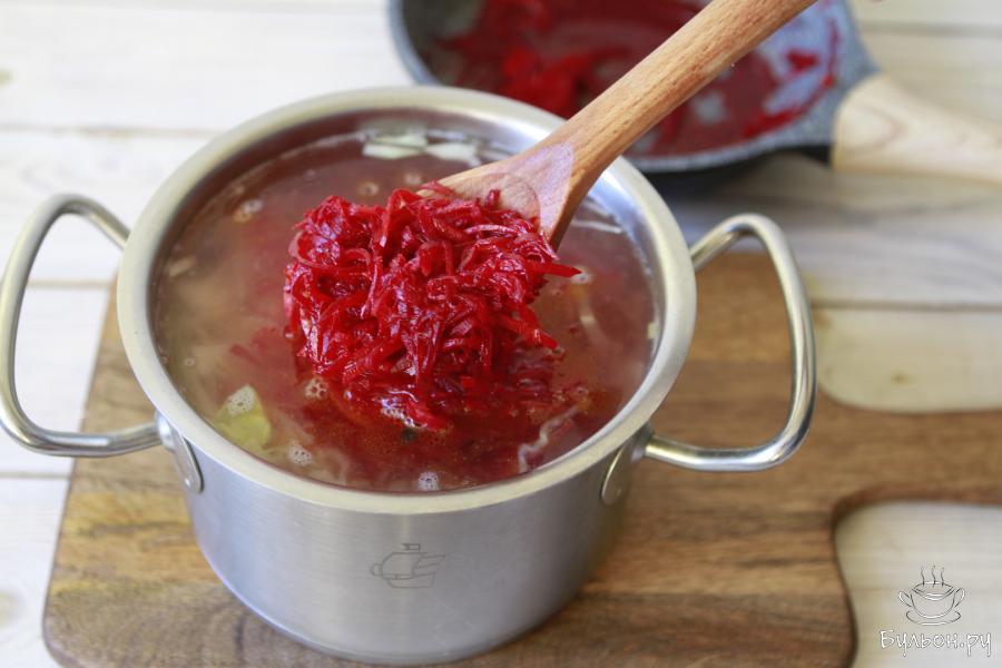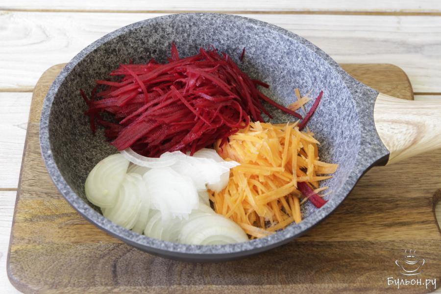 3. Морковь, свеклу и репчатый лук почистить, мелко нашинковать или натереть на терке, зубчик чеснока пропустить через пресс. Овощи потушить до мягкого состояния на среднем огне. В самом конце добавить лимонный сок.