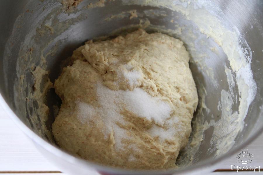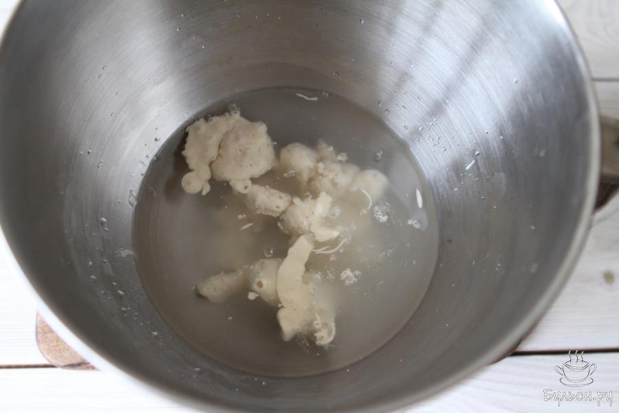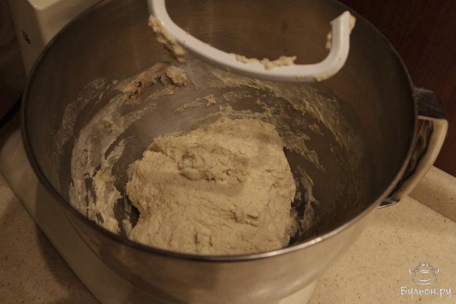5. Затем добавить соль и оставшуюся воду. Вымесить тесто миксером на средней скорости, примерно, 5-7 минут. Тесто получится неоднородным и будет прилипать к рукам.