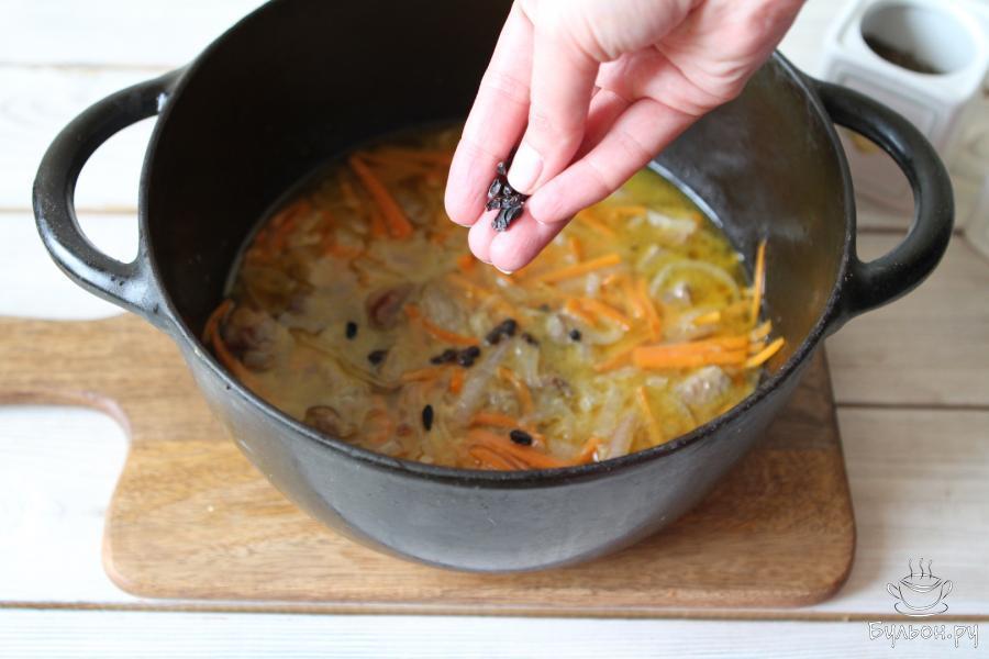 3. Готовим зирвак для плова. Казан разогреть вместе с маслом. Обжарить кусочки индейки до золотистой корочки. Как только мясо будет готово, в казан добавить морковь и лук, обжарить овощи до мягкого состояния, постоянно помешивая.