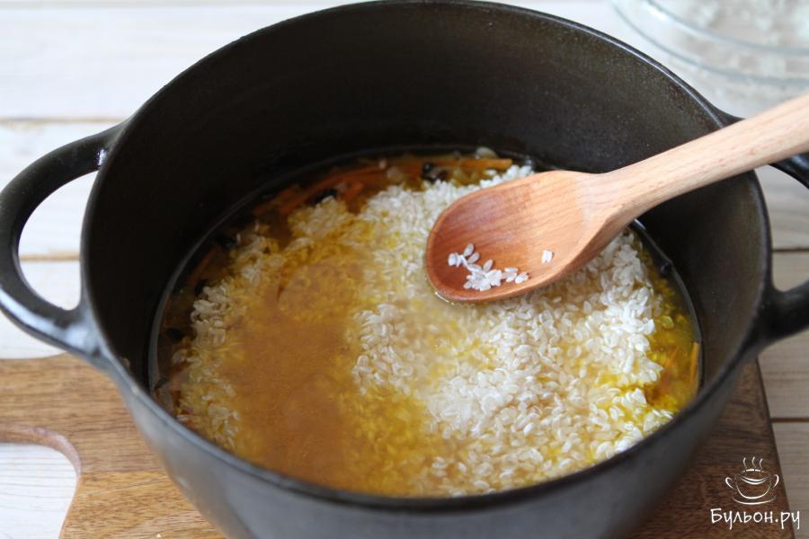 6. Рис хорошо промыть, откинуть на дуршлаг, лишняя жидкость не нужна. Чеснок и перец чили достать. Рис переложить в казан. Огонь прибавить, должна выкипеть вся жидкость. Уложить поверх чеснок и перец. Рис при этом не перемешиваем.