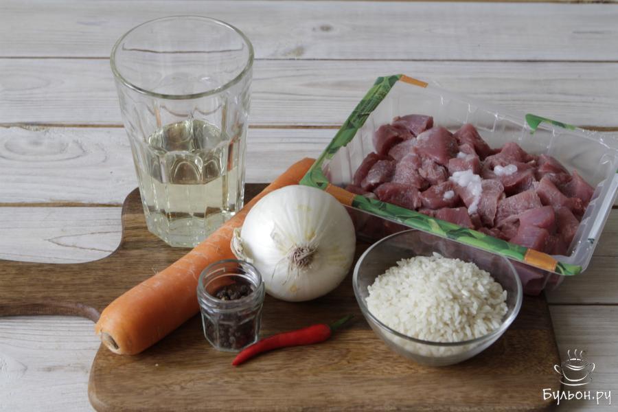 1. Подготовить все ингредиенты по списку. Филе индейки нарезать на небольшие кусочки, овощи почистить, рис перебрать.