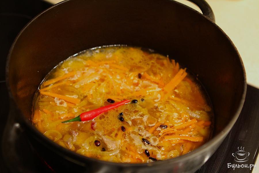 5. Для аромата можно добавить перец чили и головку свежего чеснока целиком. Убавить огонь и уваривать зирвак минут 20.