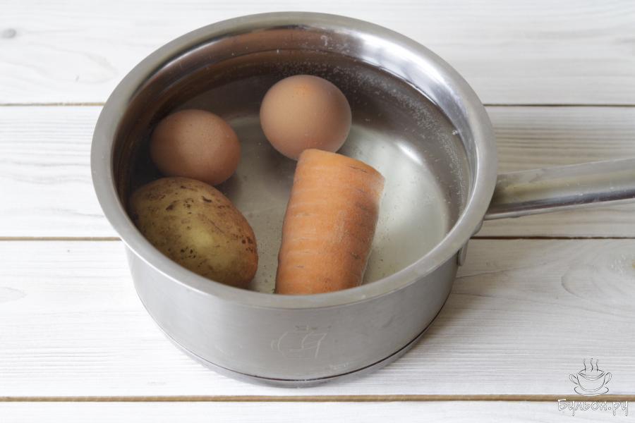 2. На две небольшие порции салата Оливье вам потребуется два яйца, картофель небольшого размера и морковь. Отварить овощи и яйца до готовности.