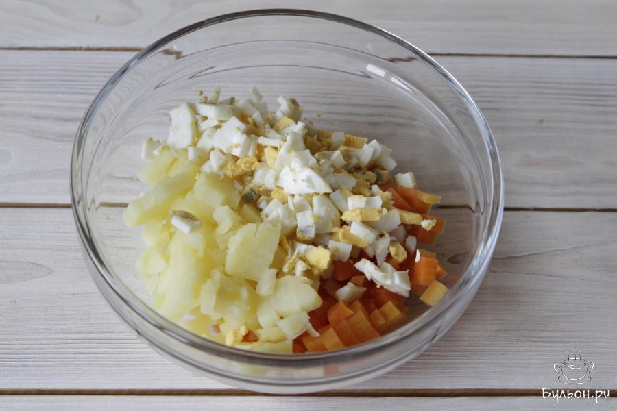 3. Вареные овощи остудить, почистить и нарезать на небольшие кубики. Яйца почистить и нарезать, один желток оставить для украшения.