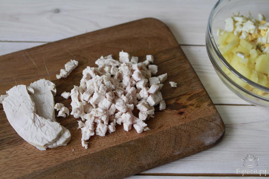 1. Филе индейки необходимо отварить, остудить, можно сделать это заранее. У меня была грудка индейки, я отварила ее со специями. Мясо пошло в салат, а бульон оставила для приготовления вторых блюд.