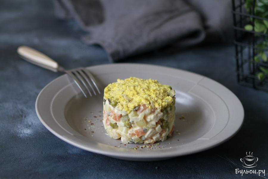 7. Все ингредиенты хорошо перемешать. Дать настояться салату 5-10 минут, можно убрать на это время его в холодильник. Через кондитерское кольцо выложить салат и украсить его шапку растертым желтком. Приятного Вам аппетита.
