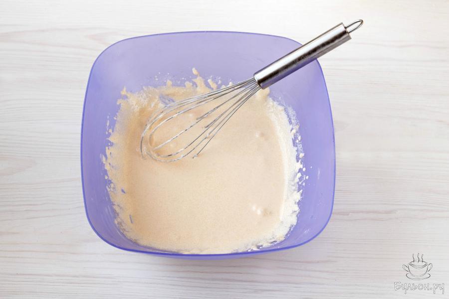 4. Желтки соедините с сахаром. Тщательно взбейте, пока масса не побелеет, а сахар практически полностью растворится.