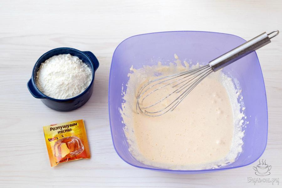 6. К взбитым яичным желткам, помешивая, постепенно добавьте просеянную с разрыхлителем пшеничную муку.