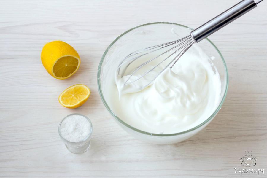 5. К яичным белкам добавьте щепотку соли и несколько капель лимонного сока. Взбейте белки до получения пышной, устойчивой пены. Белки комнатной температуры, взбиваются медленней, чем охлажденные, но они не так сильно опадают и менее капризны при выпечке.