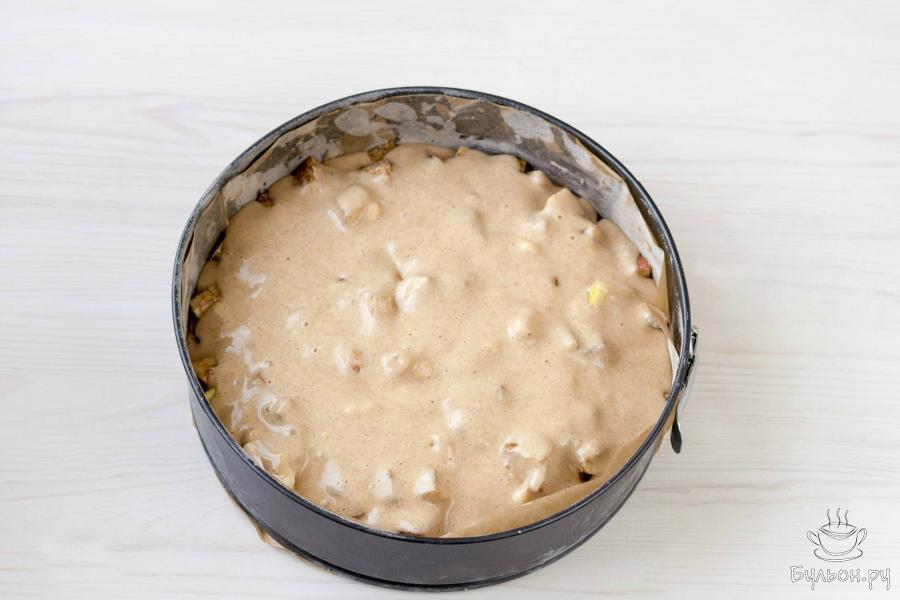 9. Затем, влейте в форму оставшееся тесто, стараясь равномерно распределить его по поверхности яблок. Поместите пирог в разогретую до 180 градусов духовку и выпекайте 45-50 минут. Через 20-25 минут, когда верх пирога подрумяниться, форму можно прикрыть фольгой.