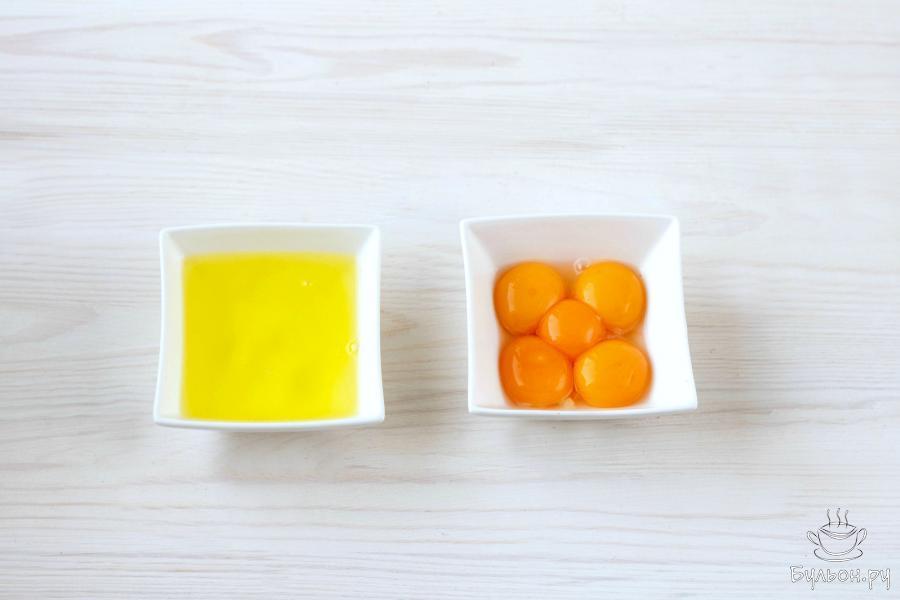 1. Яичные желтки отделите от белков. Для приготовления пирога используйте куриные яйца комнатной температуры. При необходимости, яйца можно подогреть поместив на несколько минут в чашку с теплой водой.