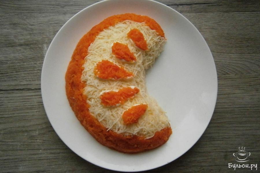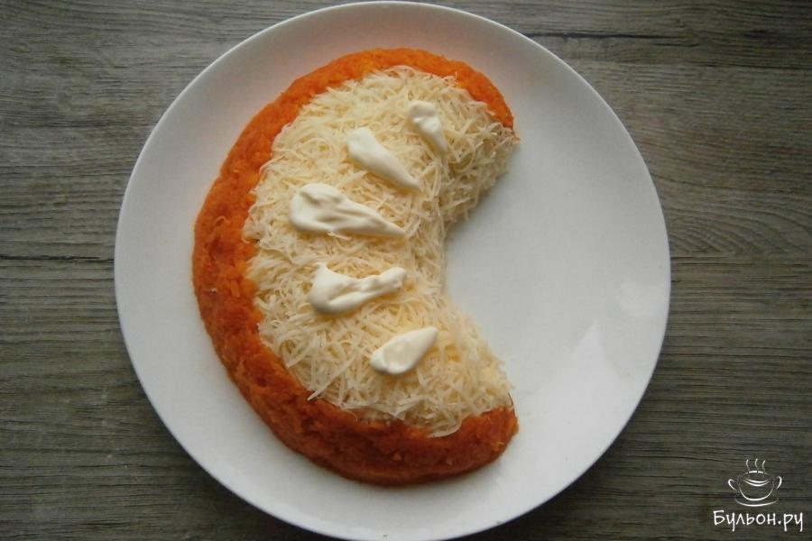 6. Бока, с внешней стороны салата, аккуратно, закрыть вареной морковью, которую также натереть. Сверху нанести полосочки майонеза, похожих на капельки.