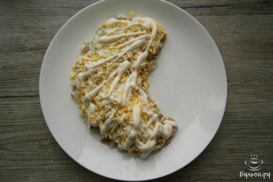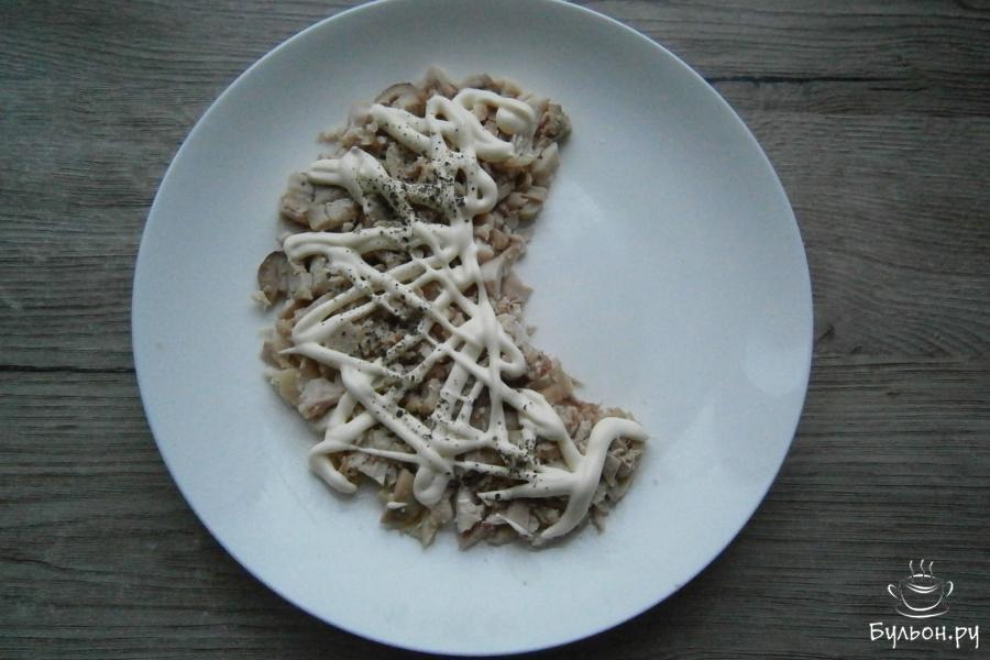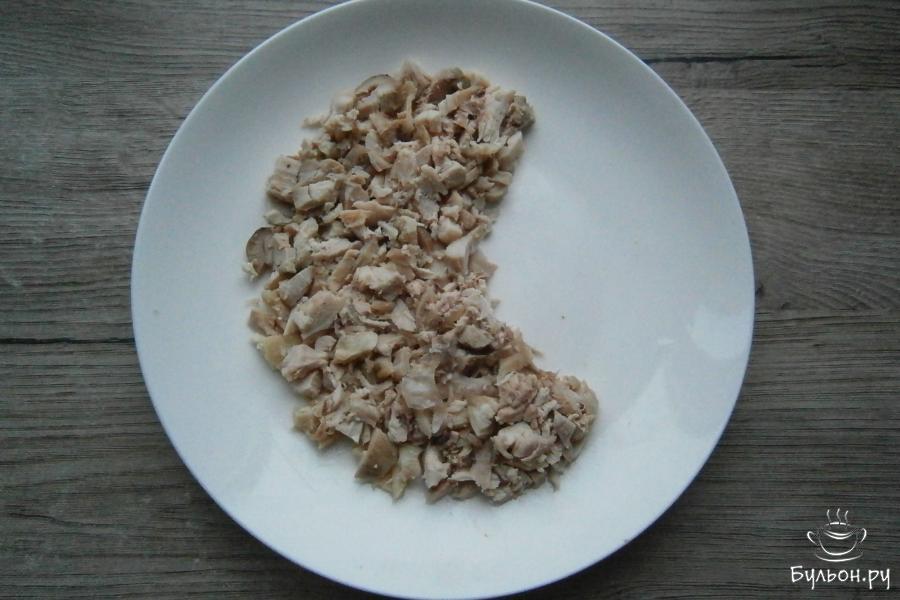 1. Перед приготовлением салата, отварить куриные бедра, морковь и куриные яйца. Мясо остудить и срезать с костей, порезать кусочками, все остальное почистить. На тарелку или любое плоское блюдо выкладываем кусочки курицы в виде полумесяца.