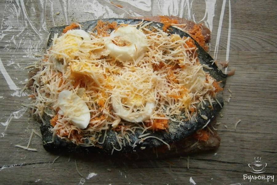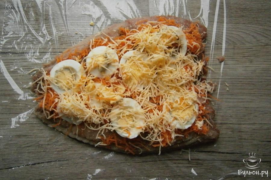 7. Морковку и два яйца предварительно сварить, а затем, полностью остудить и очистить. Натереть морковь и выложить половину на пласт рыбы, сверху - кружочки одного яйца. Также, сверху, все посыпать желатином.