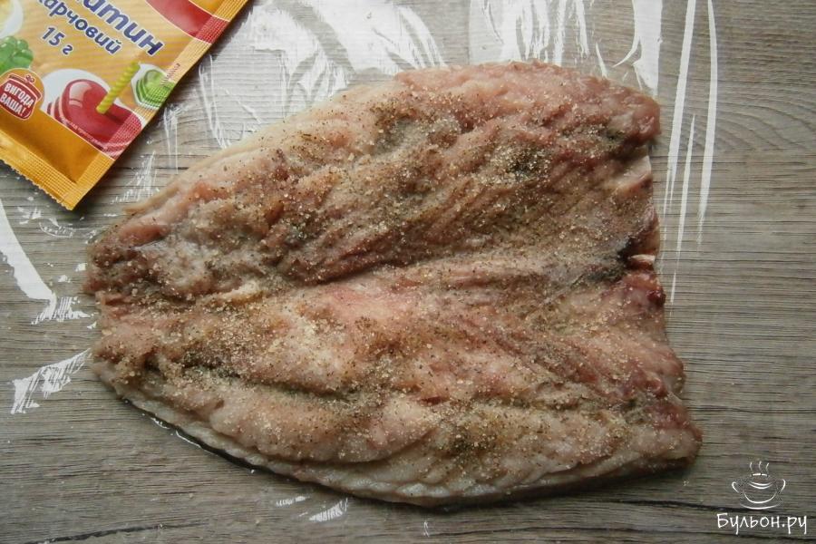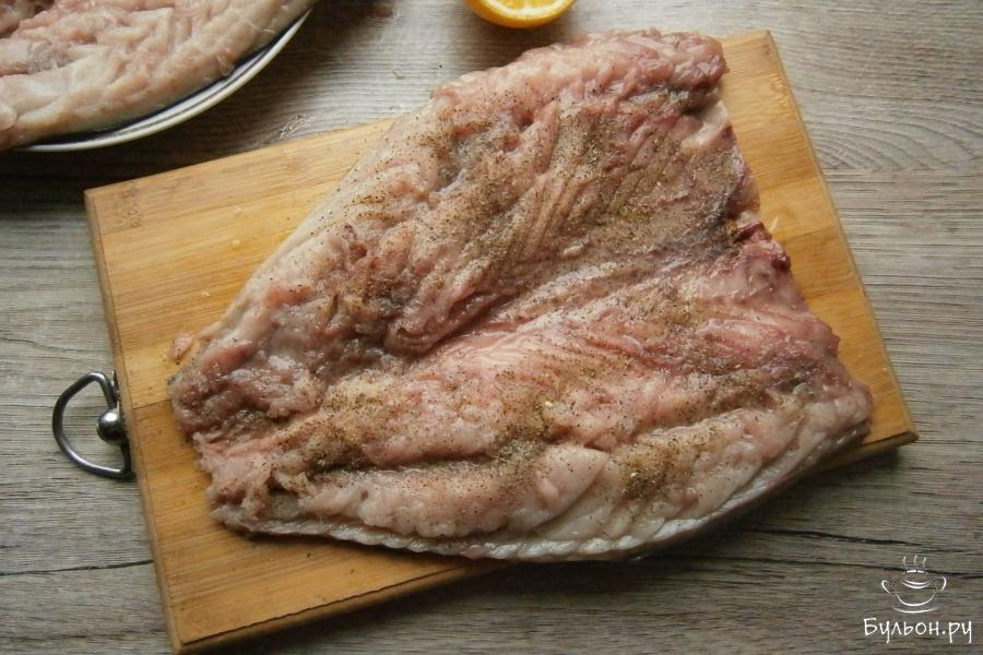 6. Развернуть пищевую пленку, поместить на нее один пласт рыбы, кожей вниз, хорошенько посыпать сухим желатином.