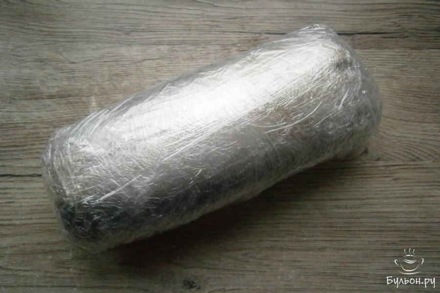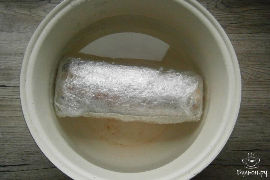 11. Далее, аккуратно и плотно, с помощью пленки, свернуть рыбу в рулет. Обмотать его еще несколькими слоями пленки, чтобы не осталось ни части открытой рыбы.