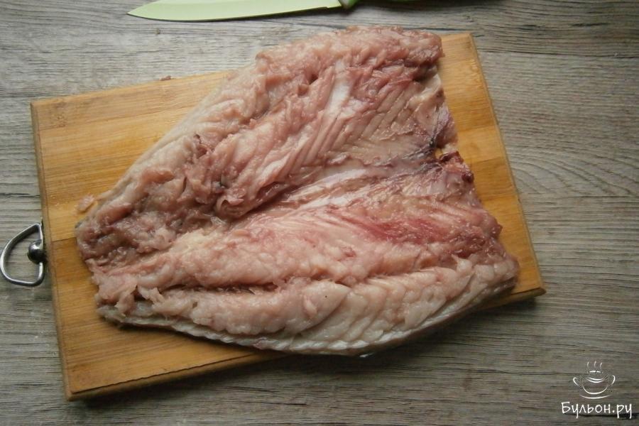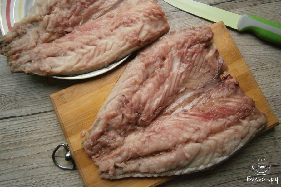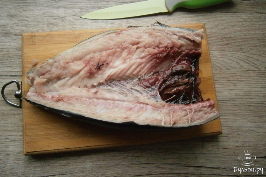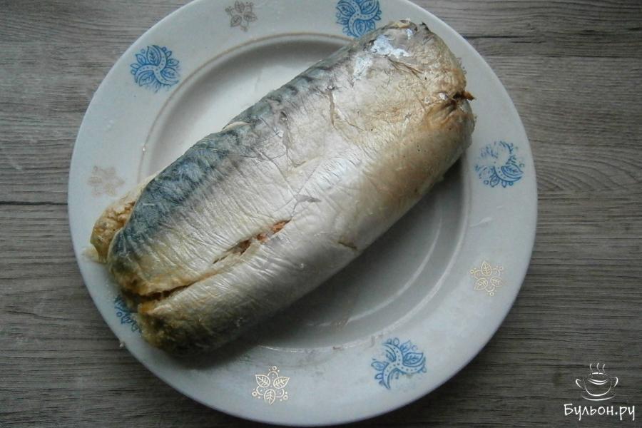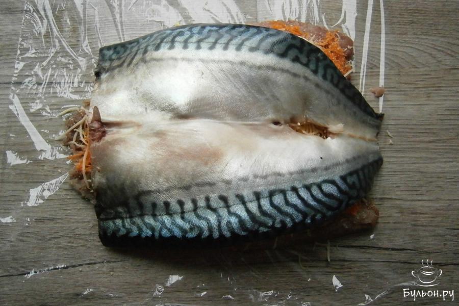 9. Второй пласт скумбрии выложить сверху, кожей вверх, только так, чтобы хвостовая часть была с другой стороны.