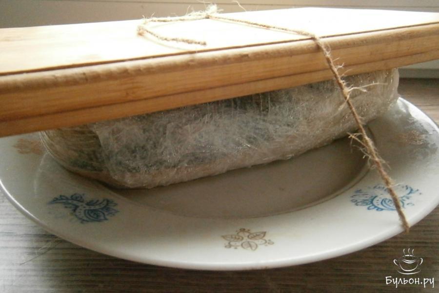13. Если варить в кастрюле, воду нужно закипятить, выложить рулет и варить на слабом огне около получаса. Готовый рулет вынуть из воды и поместить его под небольшой гнет, дать остыть. Затем, отправить вместе с гнетом в холодильник на 8-10 часов.