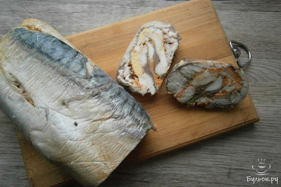 Скумбрия - замечательная рыбка, которую можно солить, запекать, печь с ней пироги. Я предлагаю вам попробовать приготовить из скумбрии необычайно вкусный и очень красивый рулет, который будет уместен на любом праздничном столе. Начинить рулет можно морковью, сыром и вареными яйцами, как это сделала я, а вы можете еще добавить на свой вкус - курагу, чернослив, зелень, лук и т. д. или вообще готовить рулет без начинки. Рулет смотрится очень эффектно в разрезе как с начинкой, так и без нее, к тому же, закуска эта очень вкусная. Главное в этом рецепте - это правильно подготовить скумбрию и перед тем, как разрезать, выдержать рулет определенное время под небольшим гнетом в холодном месте. Попробуйте, вам обязательно понравится это блюдо.