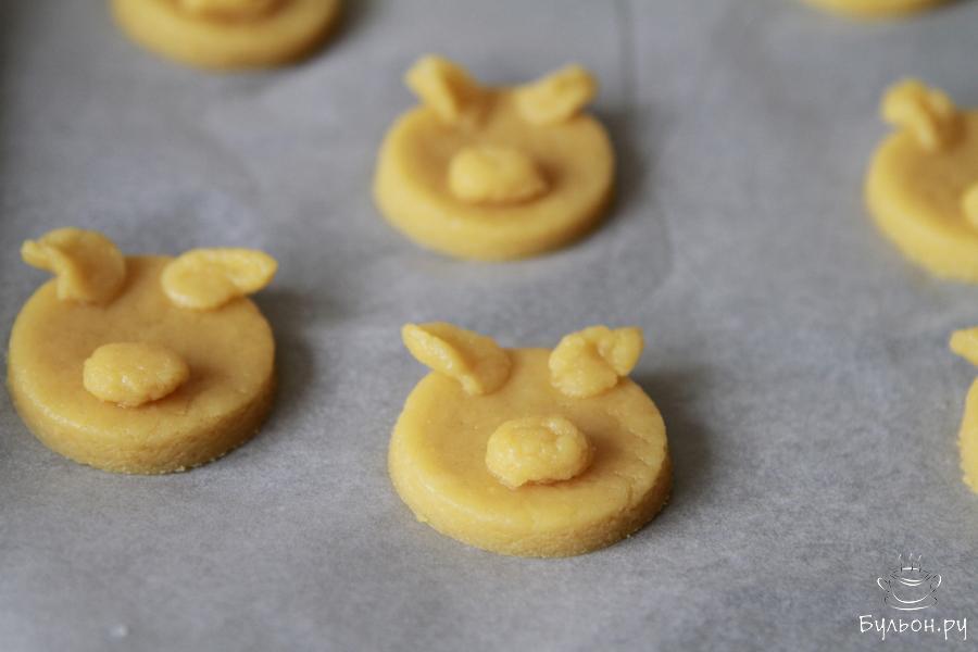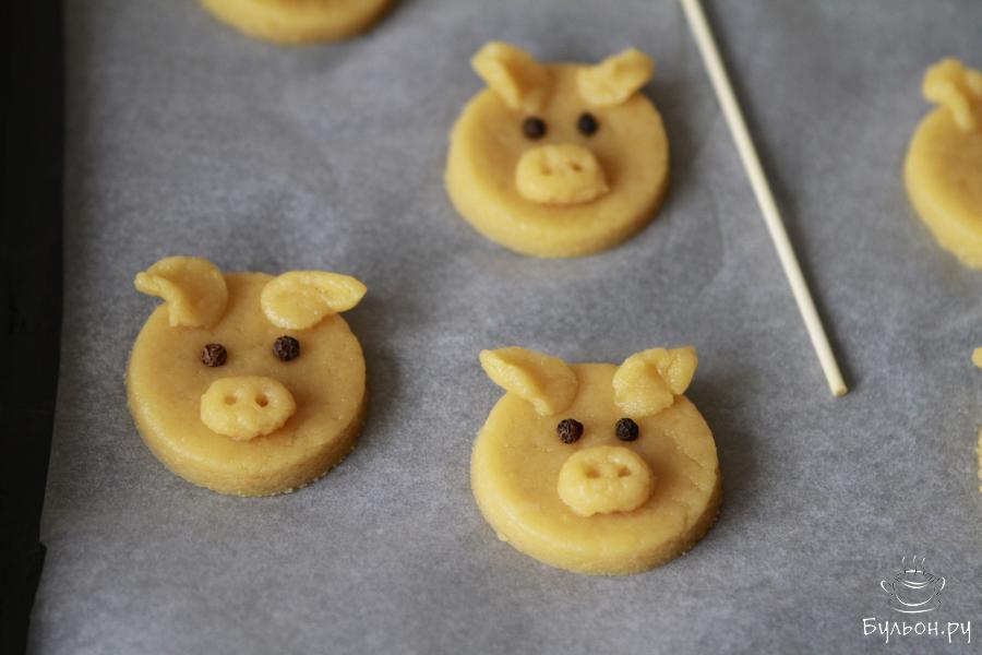 6. Из остатков теста слепить пятачки и ушки свинок. Ушкам придать форму. Пятачки и ушки уложить на мордочку, слегка прижав.