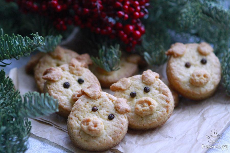 Символом Нового года 2019 является свинья. По этому случаю предлагаю пополнить рецепты новогодних десертов и испечь печенье в виде свинки. Этим печеньем можно не только угостить друзей и родственников, но еще и украсить новогоднюю елку. За основу берется самое обычное песочное тесто. Я замешивала его на желтках, без добавления белков. Можно добавить немного холодной воды, но тесто тогда получится жестче. Ну а дальше включайте фантазию. Можно испечь основу печенья, т. е. мордочку свинки и украсить ее белковой глазурью ( здесь в ход можно пустить оставшиеся белки). Или вылепить из песочного теста детали, а именно носик, ушки, и собрать печенье. Но делать это лучше всего перед выпечкой. Из этого количества ингредиентов получается примерно 25 мордочек свинок. Хранить печенье лучше всего в контейнере с плотной крышкой.