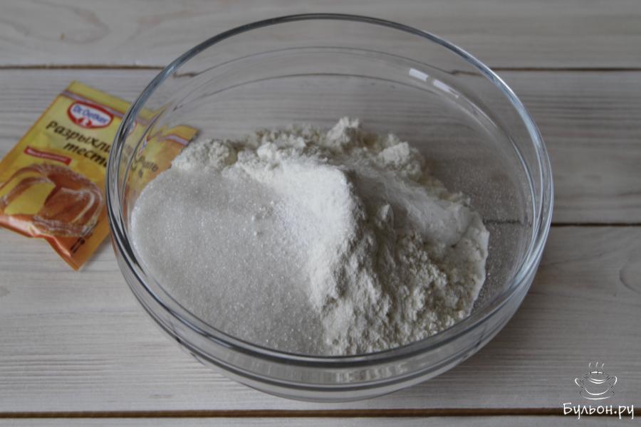 1. Подготовить все ингредиенты по списку. В глубокой миске для начала смешать все сухие ингредиенты: муку, сахар, разрыхлитель, соль (муку предварительно рекомендую просеять).