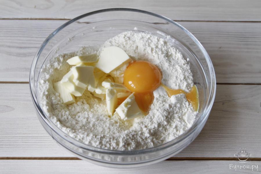 2. Далее порубить охлажденное сливочное масло и добавить два желтка (белки убрать в холодильник, из них можно приготовить безе или домашний зефир).