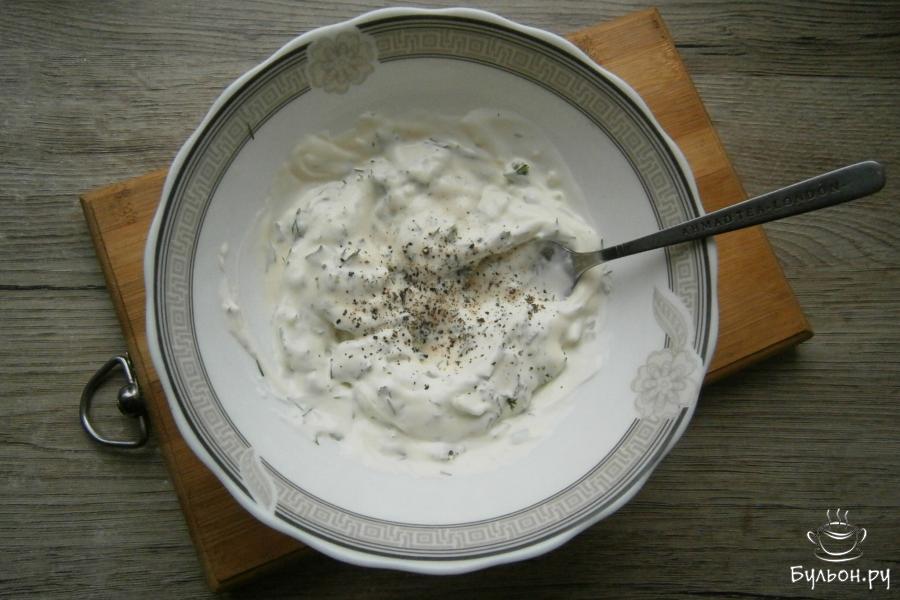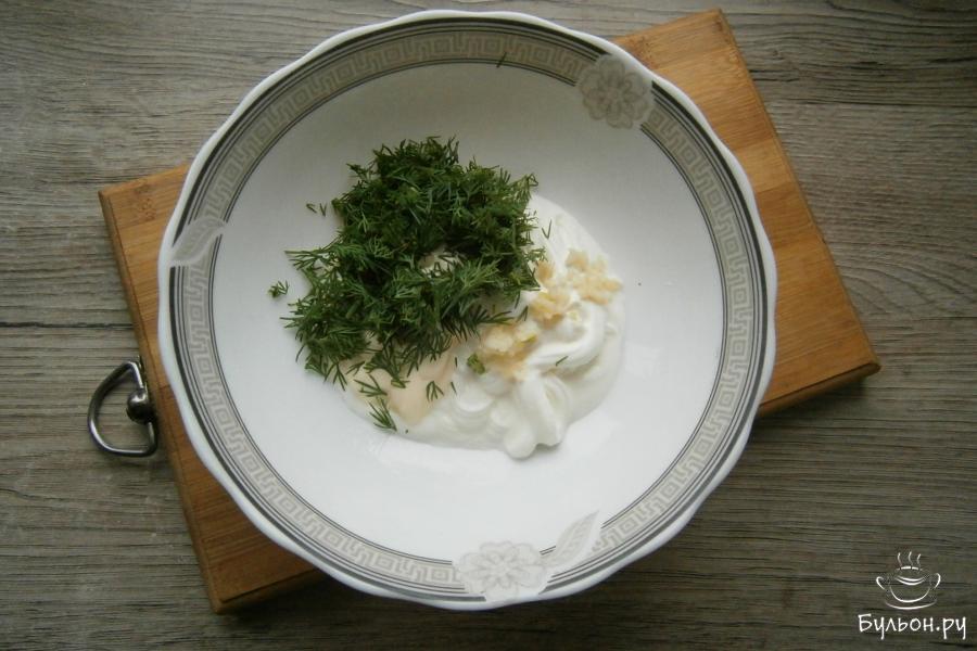7. В сметану с жирностью 20 процентов добавить две столовые ложки порезанного мелко укропа и измельченный чесночок, немножко все посолить.