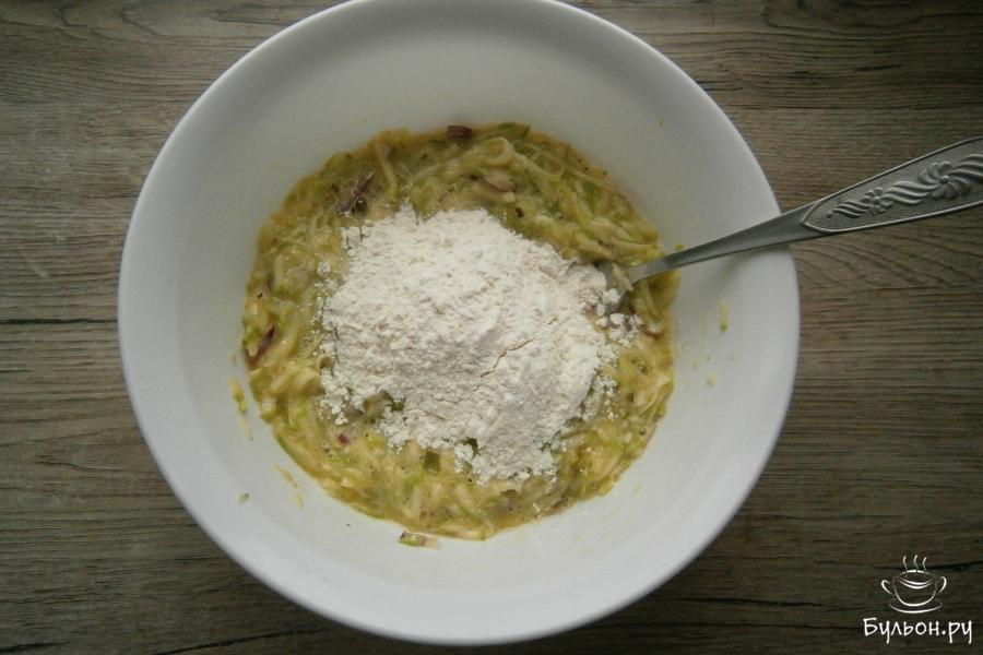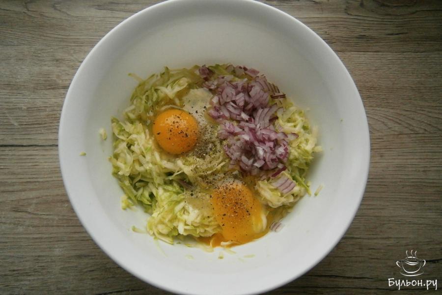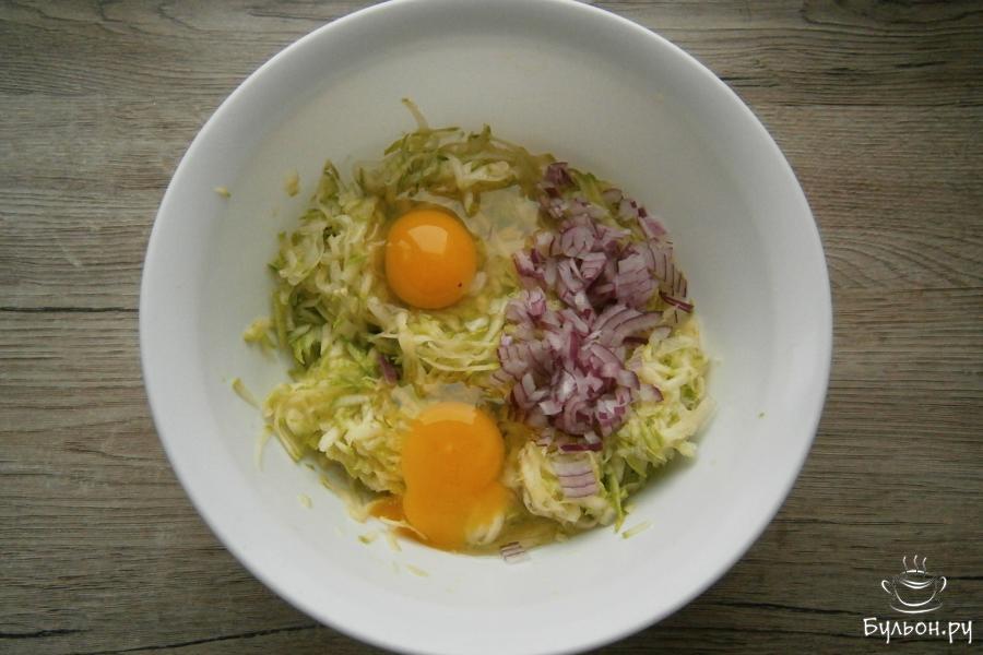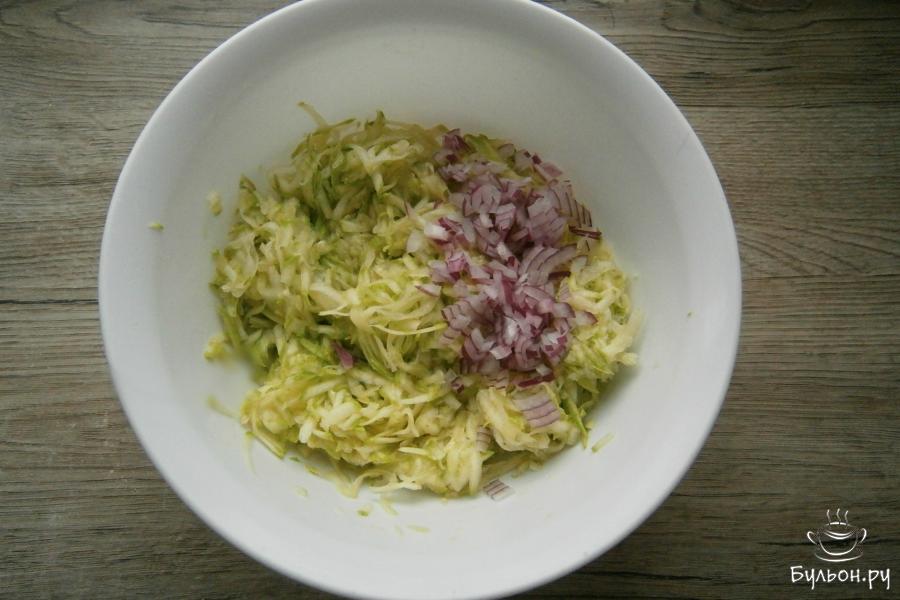 1. Кабачки следует натереть на средней или крупной терке, хорошо отжать от жидкости. Добавить мелко нарезанный красный или репчатый лук.
