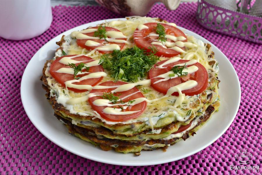 12. На сыр выложить кружочки помидоров. Закусочный тортик из кабачков готов. Украсить его сверху сметаной и зеленью оставшегося укропа, дать настояться и полностью остыть в прохладном месте, после чего можно разрезать на части.