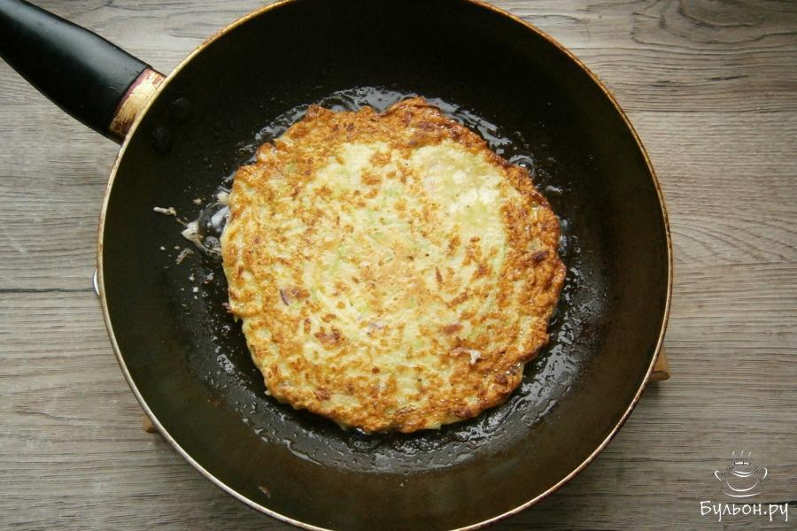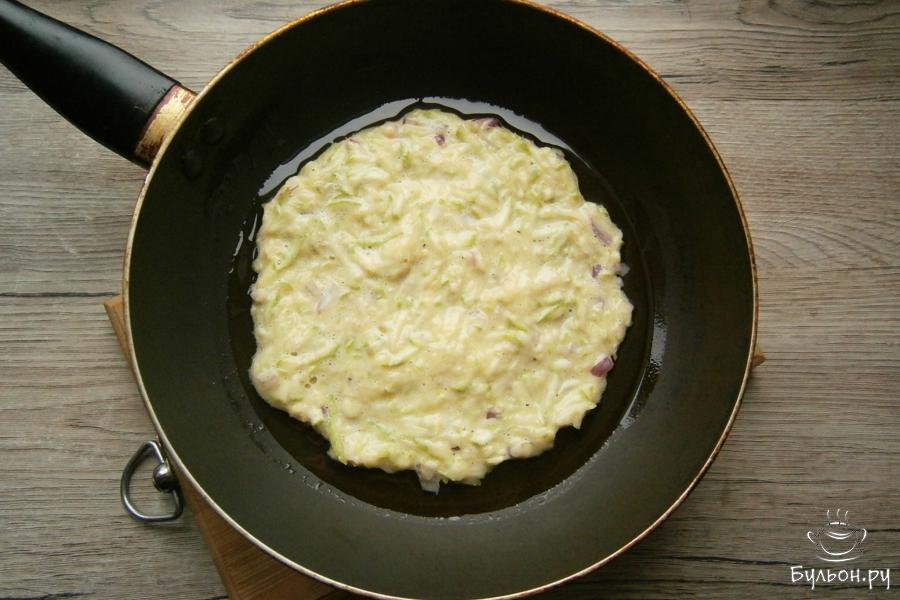 5. Разогреть сковородку с маслом. Выкладывать кабачковую массу в сковороду ложкой в виде блина. Жарить до румяности.