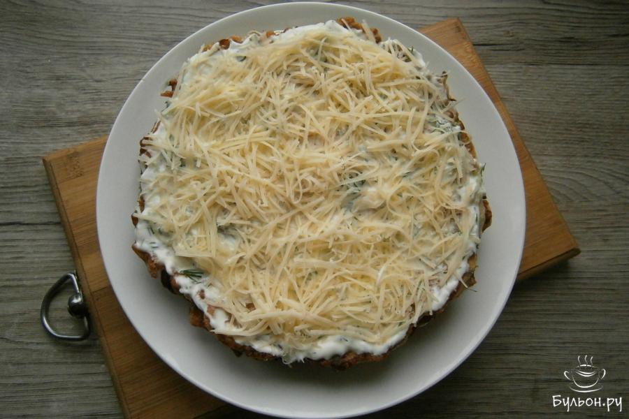 11. Далее, таким же образом выкладывать еще два блина, смазывая их сметанной намазкой. Верхний блин посыпать тертым сыром.