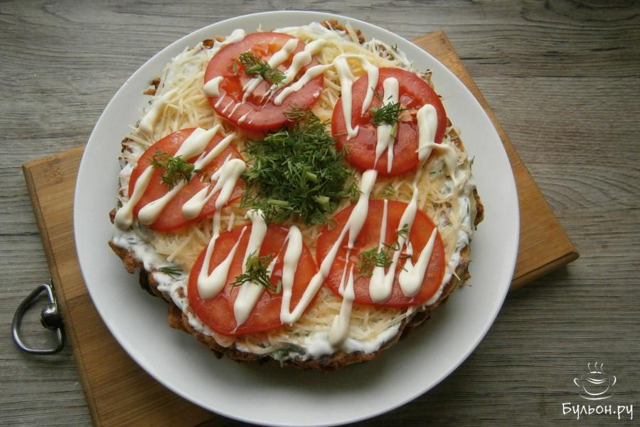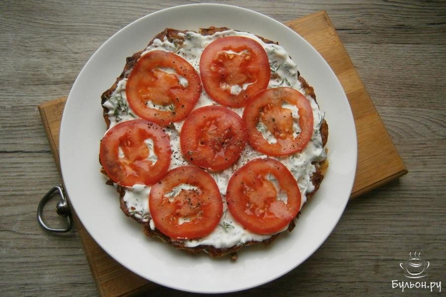 10. Сверху разместить еще один блин, также, смазать сметанной смесью и выложить тонко порезанные кружочки помидоров, которые чуточку поперчить.