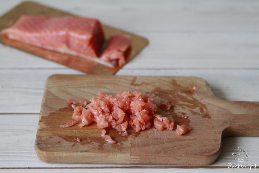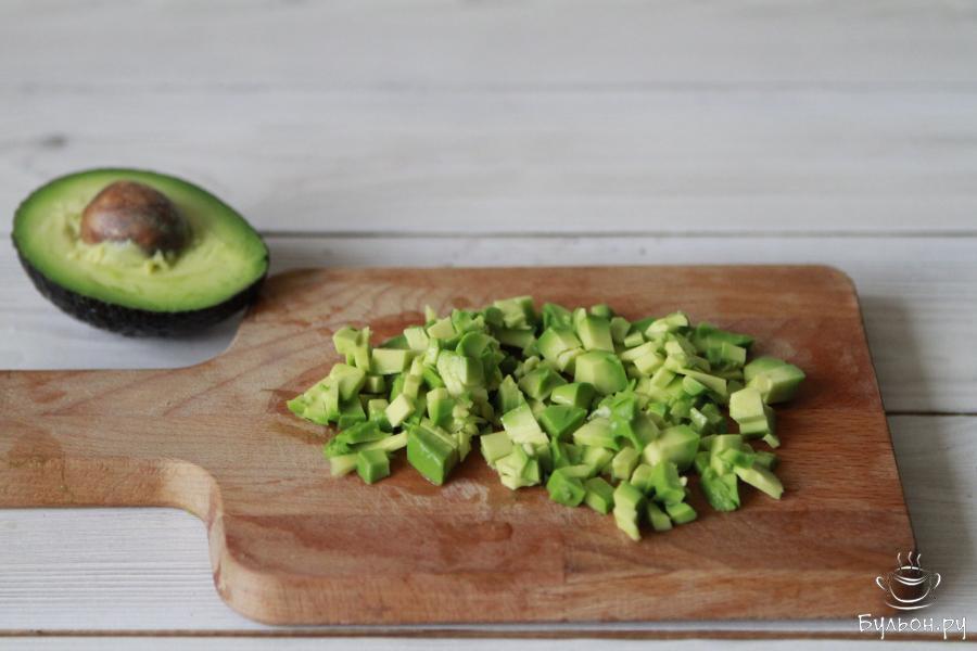 4. Авокадо почистить и нарезать так же как и семгу на небольшие кусочки. Сразу же сбрызнуть соком лимона.