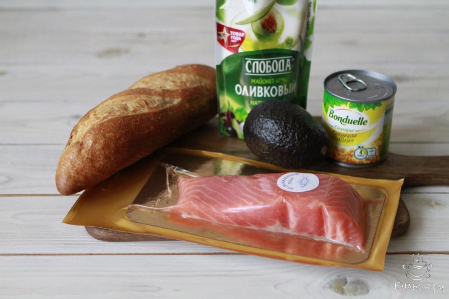 5. Собираем салат. Для удобства возьмите кулинарное кольцо. Первым слоем выложить семгу, слегка ее прижать ложкой. Затем авокадо и консервированную кукурузу.