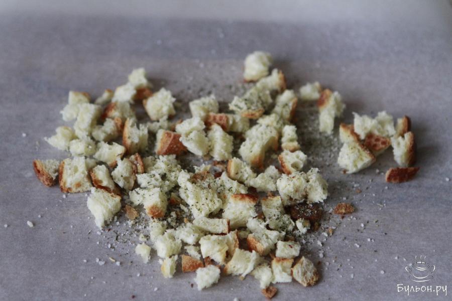 2. Для салата потребуются сухарики. Можно воспользоваться покупными, но мне нравятся домашние. Нарезать кусочки батона на небольшие квадратики, присыпать прованскими травами и подрумянить в духовке около 10 минут.