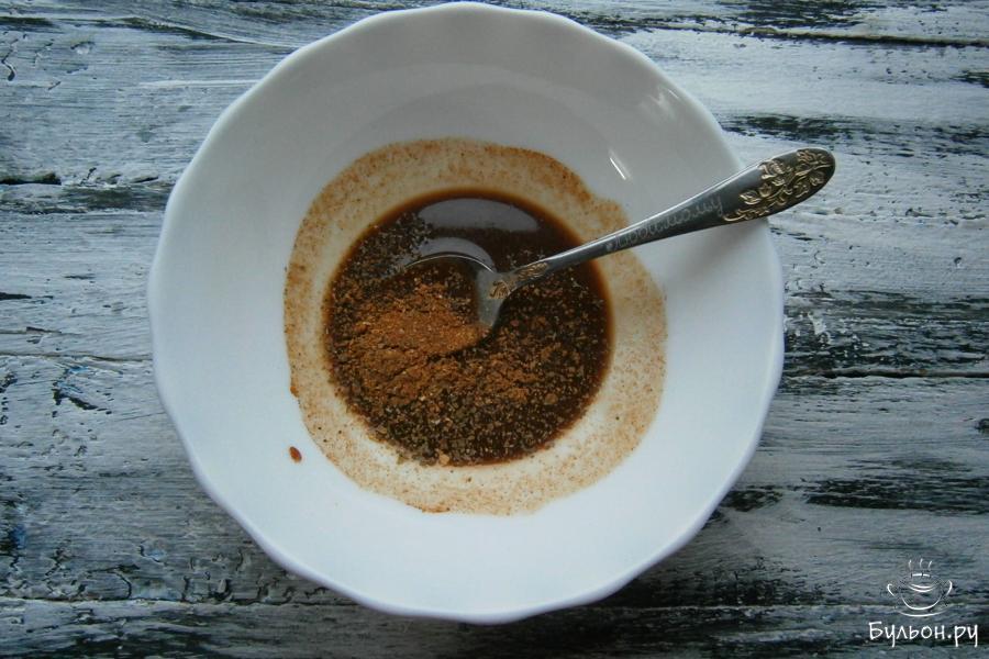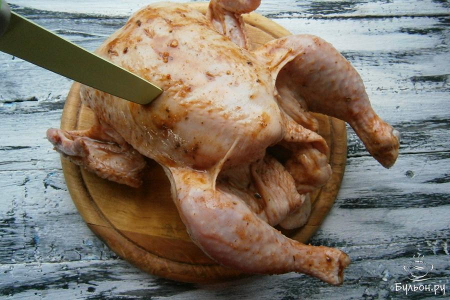 4. Тушку курицы поколоть со всех сторон ножом, натереть солью и подготовленной ароматной смесью снаружи и внутри, оставить на 1-2 часа.