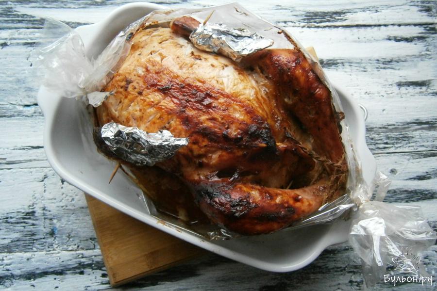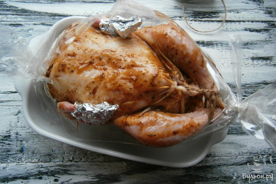 8. Курицу поместить в рукав для запекания так, чтобы она была в нем до половины. Концы рукава перевязать.
