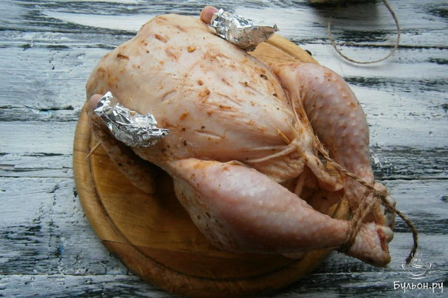 7. Зубочистками сколоть кожу курицы, чтобы яблоки не вываливались, ножки связать нитью, кончики крылышек обернуть фольгой.