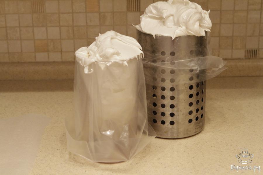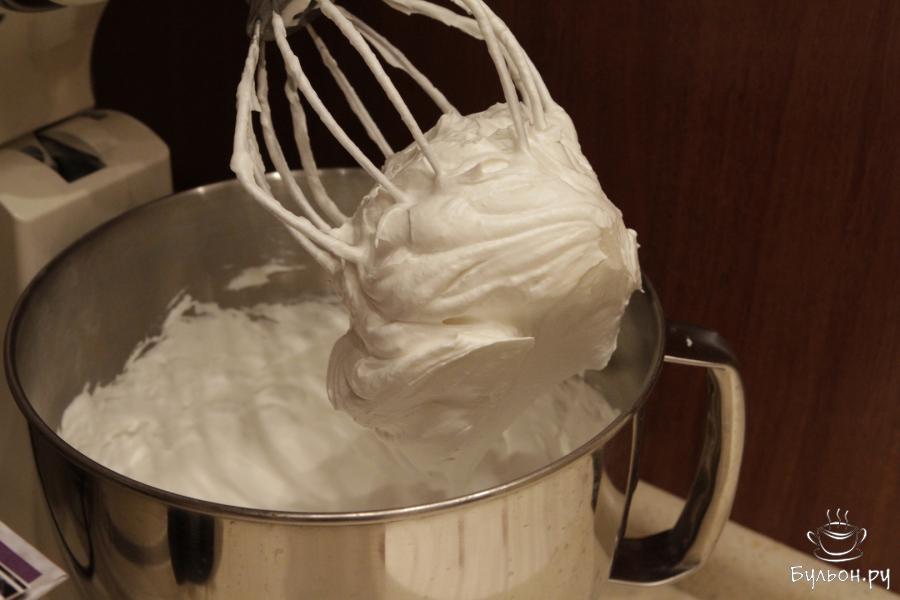 7. Белок с пюре нужно взбить до жестких пиков, у меня на это ушло примерно 7 минут, к этому времени сироп будет готов, не снижая скорости влить сироп частями и взбивать еще пару минут.